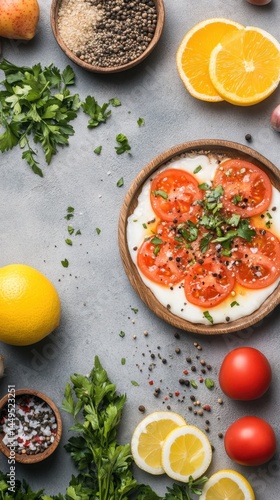 Overhead view food flat lay on table. White creamy dish with sliced red tomatoes. Orange, lemon and fresh parsley scattered around