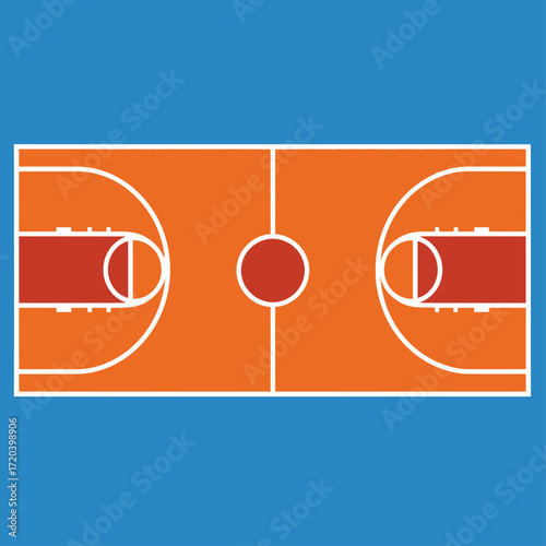 Overhead view of a basketball court featuring lines, circles, and a rectangular key area.
