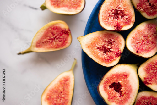 Overhead view of a blue plate covered with halved figs over a white marble background with more pieces of halved figs