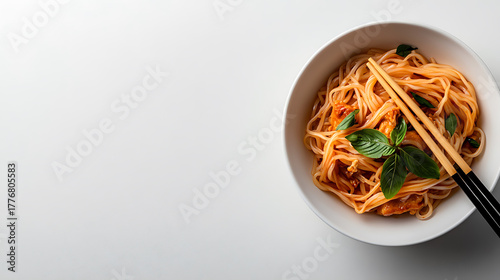 Overhead view of a bowl filled with pasta, topped with basil and chopsticks. Placed on a white surface, the scene captures a blend of culinary art and minimalistic presentation.