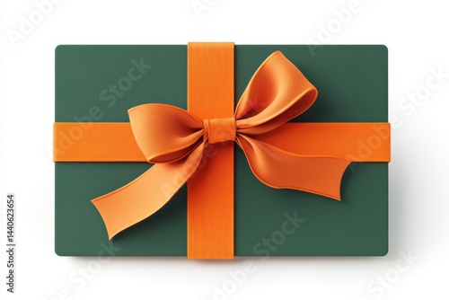 Overhead view of a dark green gift box with a vibrant orange ribbon tied in a bow on a white background