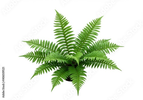 Overhead view of a fern plant with vibrant green leaves against a white background studio shot