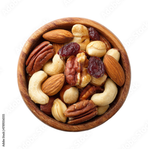 Overhead view of a rustic wooden bowl brimming with a nutritious blend of almonds, cashews, pecans, and dried cranberries, artfully arranged for a healthy snack, PNG set with transparent background