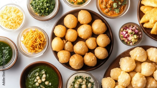 Overhead view of a serving of pani puri with various fillings, set against a clean backdrop, highlighting the textures