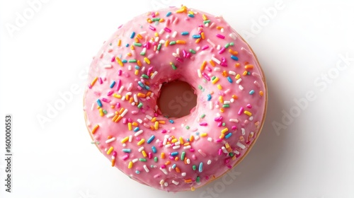 Overhead view of a single pink glazed donut with vibrant rainbow sprinkles, crisp edges and glossy surface, isolated on pure white backdrop, fun and appetizing composition