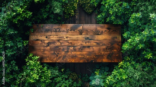 Overhead view of a wooden table surrounded by greenery, perfect for eco-friendly themes