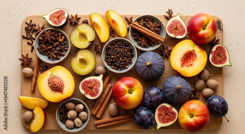 Overhead view of assorted fresh fruits and spices arranged on a wooden cutting board surface top down