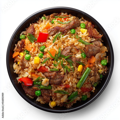 Overhead view of beef fried rice in a black bowl with vegetables on a white background studio shot