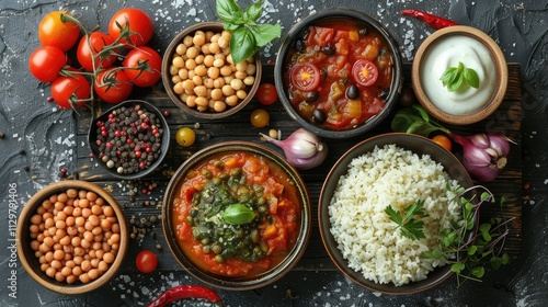 Overhead view of bowls of chickpea curry, rice, and tomato salsa with fresh herbs and spices.