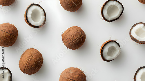 Overhead View of Coconuts Scattered on a White Background Featuring Whole and Halved Tropical Fruits