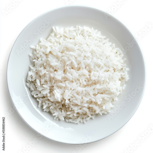Overhead view of cooked white rice served in a simple white bowl, isolated on white background.