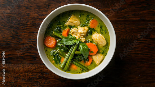 Overhead View Of Creamy Green Curry With Chicken And Vegetables