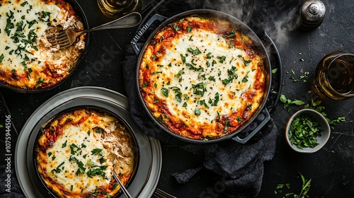 Overhead View of Delicious Steaming Chicken Casserole with Melted Cheese and Fresh Herbs Served in Elegant Bakeware on a Dark Table