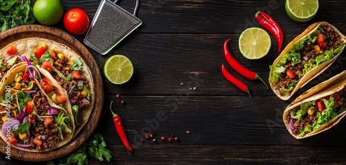 Overhead View of Delicious Tacos with Chili Peppers and Limes on Rustic Wood
