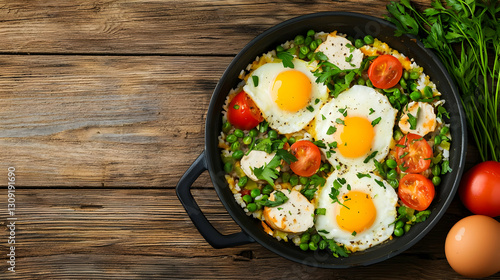 Overhead View Of Fried Eggs with Tomatoes Peas and Parsley in a Black Pan on a Rustic Wooden Table