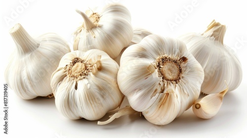 Overhead view of garlic bulbs on a plain white background.