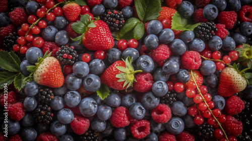 Overhead View of Mixed Berries Including Strawberries Blueberries Raspberries and Redcurrants