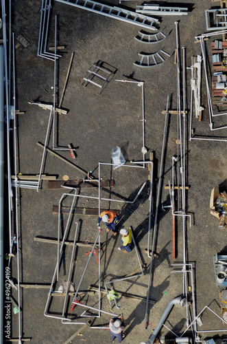 Overhead view of mobile crane and pipework with workers on site at a refinery during shutdown-Victoria.
