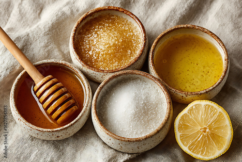 Overhead view of rustic ceramic bowls filled with golden honey granulated sugar and a slice of fresh lemon with a wooden honey dipper