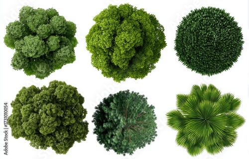 Overhead view of six diverse trees and shrubs. A collection of various green foliage, against a white background, displaying different canopy shapes. Each shows a distinct tree or shrub's top