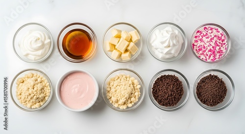 Overhead view of small glass bowls filled with dessert ingredients and toppings