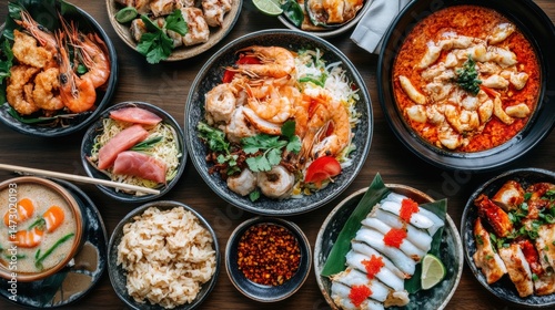 Overhead View of Varied Asian Cuisine Dishes Featuring Seafood, Rice, and Soup