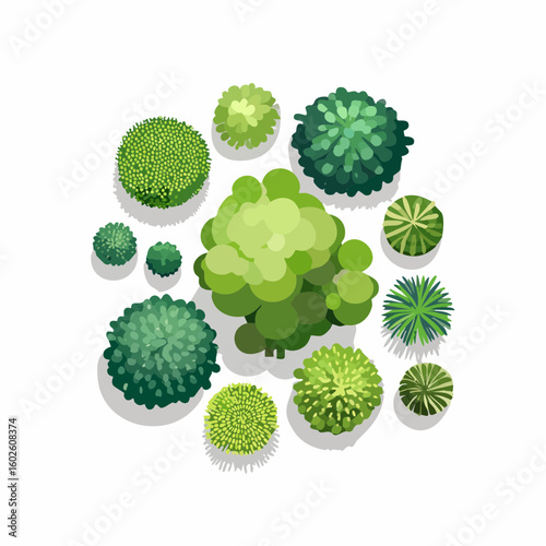 Overhead view of various green trees and shrubs illustrating diverse foliage and botanical forms on a clean white background