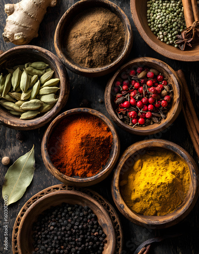 Overhead view of wooden bowls containing aromatic spices, spice rack, cooking essentials, spices, natural ingredients, pantry