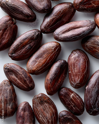 Overhead view showcases pile of raw cocoa beans for chocolate making and food photography