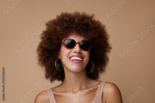 Overjoying african american woman with an afro hairstyle, wearing tortoiseshell sunglasses, hoop earrings, and braces against a beige background, dressed in a shimmery top