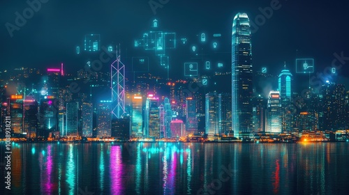 Overlaid digital icons and a vibrant city skyline at night, symbolizing SME innovation, connectivity, and global business development in the modern world.
