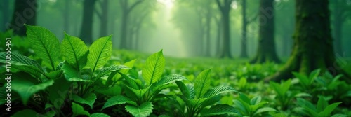Overlapping fiddlehead fern leaves in a misty forest environment, trees, nature, plants