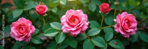 Overlapping leaves forming a border around a blooming rose bush, garden, nature