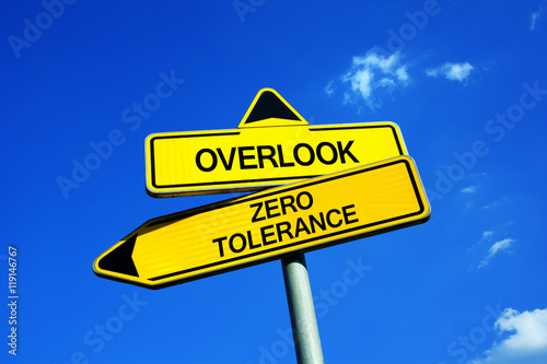 Overlook or Zero Tolerance - Traffic sign with two options - attitude towards criminals and criminality, tolerate violation of rules vs strict insisting on law and repressive force of police