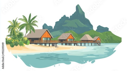 Overwater bungalows, sandy beach, and vibrant sea in Bora Bora, flat design illustration