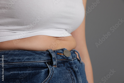 Overweight woman in tight shirt and jeans on grey background, closeup. Space for text