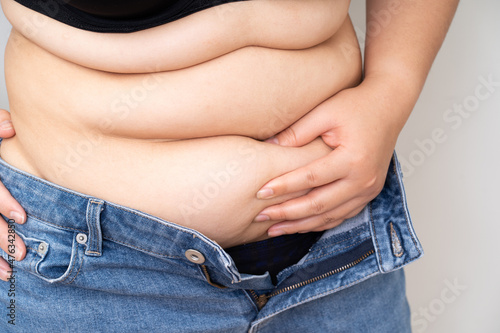 Overweight women hand touch big belly