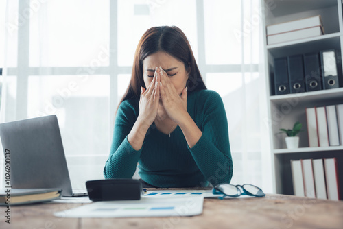 Overwhelmed Businesswoman: Stressed and frustrated, a young businesswoman sits at her desk, hands covering her face, amidst paperwork and a laptop.