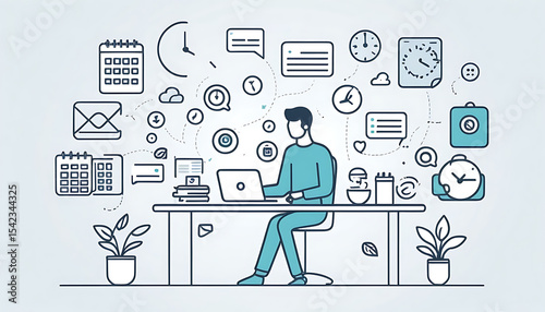 Overwhelmed: Man at Desk, Deadline Icons, Illustration.