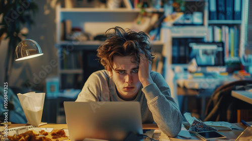 Overwhelmed student sitting in front of a laptop, surrounded by books and notes. The image depicts academic stress, multitasking, and the challenges of online learning