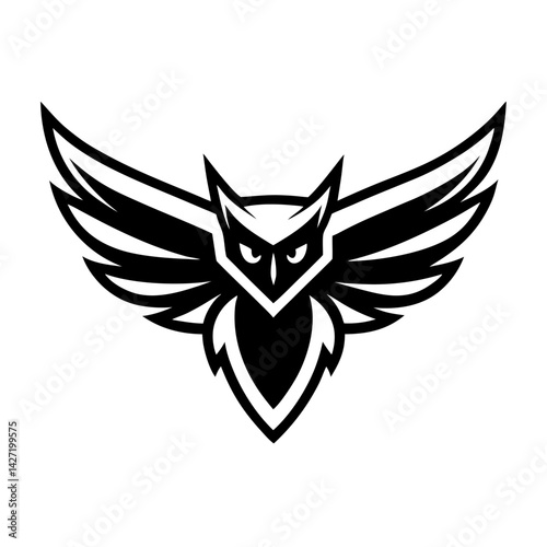 Owl emblem: A striking owl emblem, poised with open wings in a graphic, symmetrical design of black and white, representing wisdom, freedom, and intelligence.