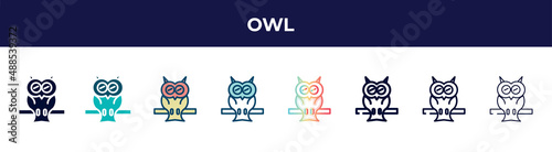 owl icon in 8 styles. line, filled, glyph, thin outline, colorful, stroke and gradient styles, owl vector sign. symbol, logo illustration. different style icons set.