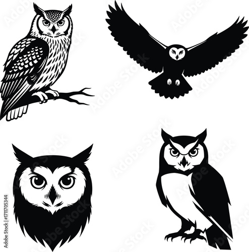 Owl illustration set featuring perched, flying, and headshot poses with feather detail, branch compositions, and expressive eye styling