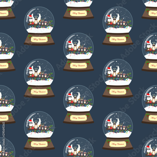 Owl in christmas costume in snowball seamless pattern
