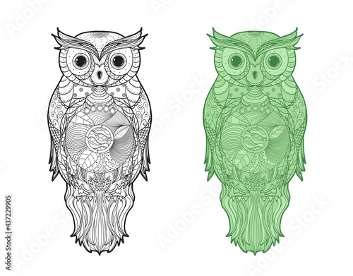 Owl on isolated white. Detailed hand drawn line bird with abstract patterns on isolation background. Abstract ornate character. Different color options