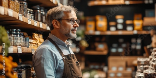 Owner examining merchandise on shelves, softly blurred shop background, bright overhead lighting creating a welcoming atmosphere