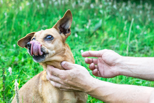 Owner holding dog's face in hands with great love and care.