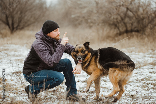 Owner man having fun with best friend german shepherd.