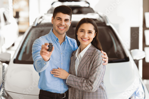 Ownership Concept. Young family embracing and standing together in front of auto in showroom, showing car keys at camera