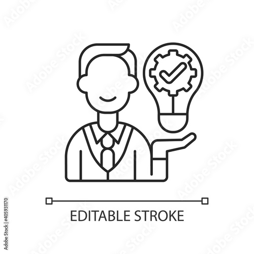 Ownership focus linear icon. Employee commitment. Creative work. Corporate values. Company policy. Thin line customizable illustration. Contour symbol. Vector isolated outline drawing. Editable stroke